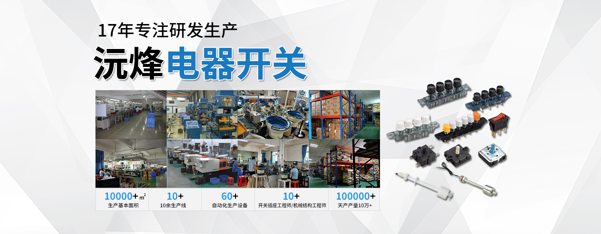 主要生產(chǎn)浮球開關(guān)、接近開關(guān)、琴鍵開關(guān)、旋轉(zhuǎn)開關(guān)、微動(dòng)開關(guān)、船型開關(guān)、拉線開關(guān)以及接線座等系列產(chǎn)品。 -